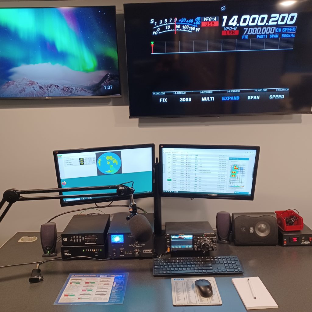 Yaesu FT-DX10 radio, Ameritron ALS-606 amplifier, LDG AT-600ProII autotuner, Astron SS30MAP DC power supply, Heil microphone, Heil PR781 microphone, Heil HB-1 boom, Green Heron RT-21 rotor control, network connected, Dell 7050 micro PC, ViewSonic twin 24″ 1080p monitors, Sony Pro headphones, 43″-4K TV and 50″-4k for radio display.