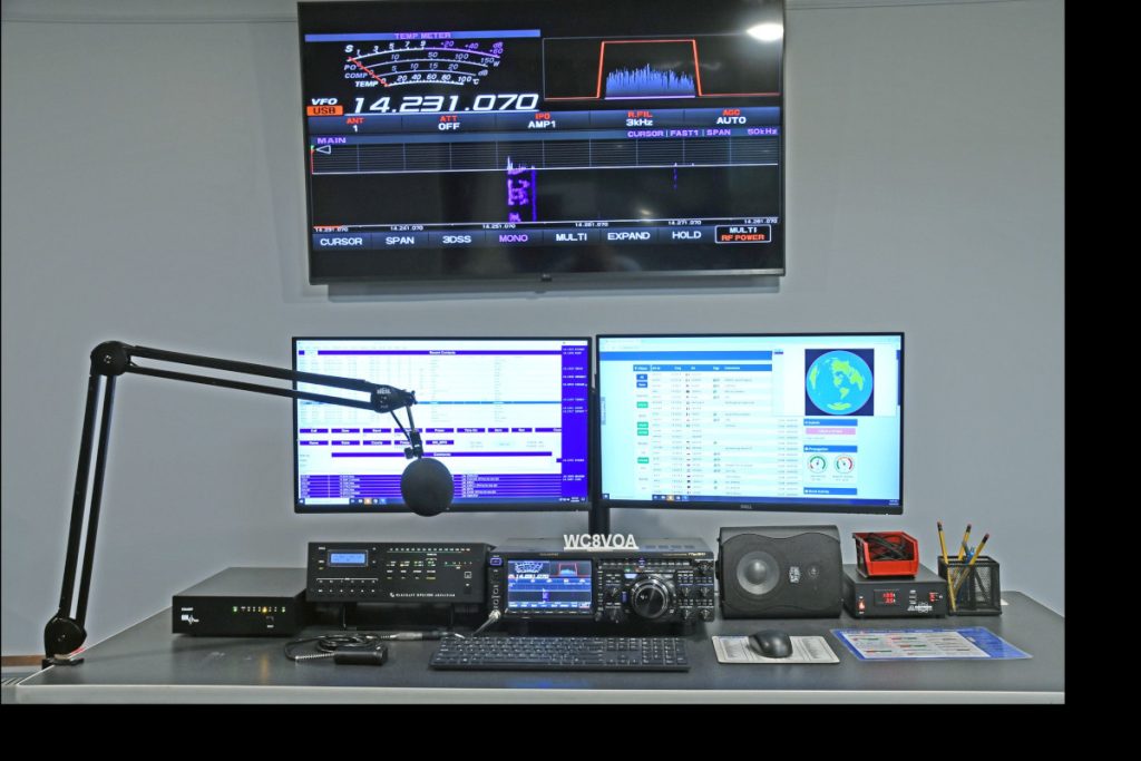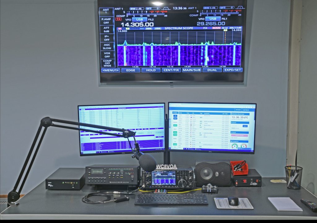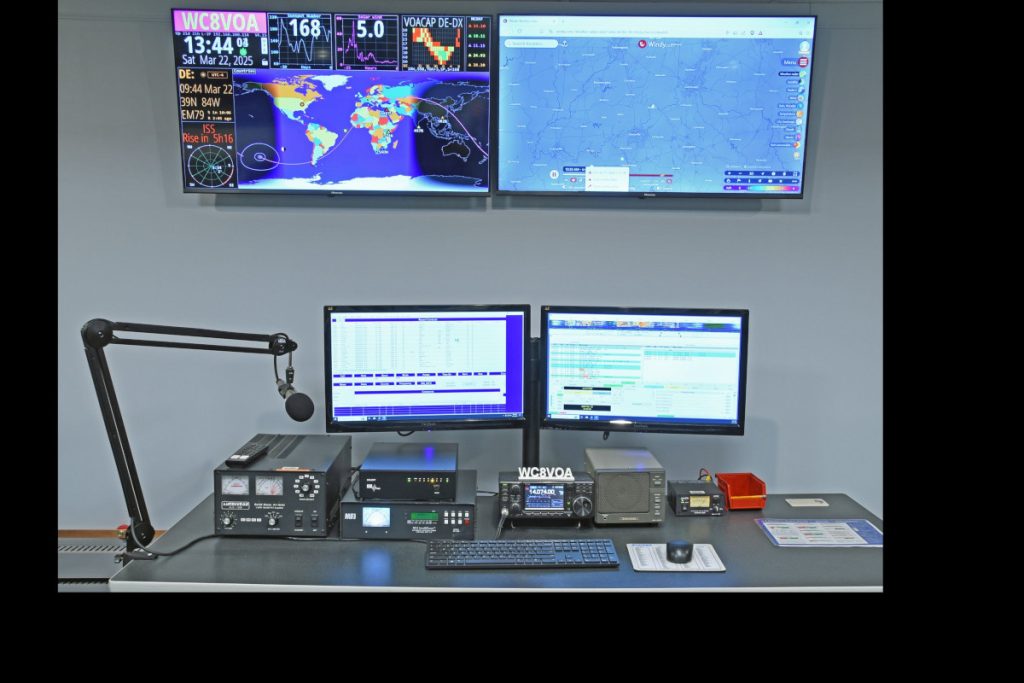 Icon 7300 radio, Ameritron ALS-606 amplifier, MFJ tuner 3kw, Astron SS30MAP DC power supply, Heil microphone, Heil ICM microphone, Heil HB-1 boom, Green Heron RT-21 rotor control, network connected, Dell 7050 micro PC, Dell twin 24″ 1080p monitors, Sony Pro headphones, twin 43″-4K TV’s for weather & news.